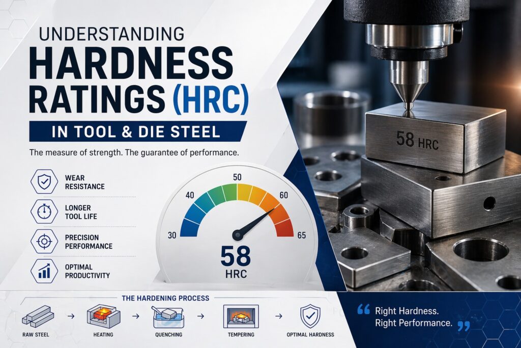 If you’ve ever looked at a tool steel datasheet and wondered what “58 HRC” means and why it matters for your die or mould. Hardness is one of the most critical properties in tool and die steel selection. Get it right, and your tooling performs reliably for thousands of production cycles. Get it wrong, and you’re facing premature wear, unexpected cracking, or both. This complete blog explains what is the Rockwell C scale means, maps HRC ranges to every major tool steel grade, and shows you exactly how to choose the right hardness for your application.